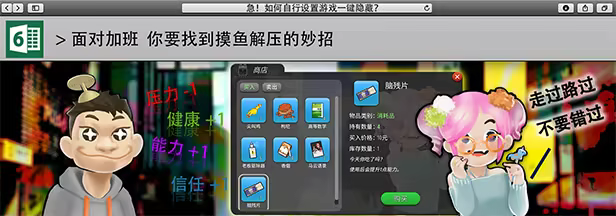 游戏中的主要角色们拥有截然不同的性格爱好,也有各自不同的故事和归宿。你可以通过聊天、送礼等各种形式,逐渐走入他们的内(shen)心(ti)。作为回报,他们可以教会你一些职场生存技能。不过,职场危机四伏,想要保住饭碗,你需要收集更多东西以求自保,请务必记得多多流连于小卖部。