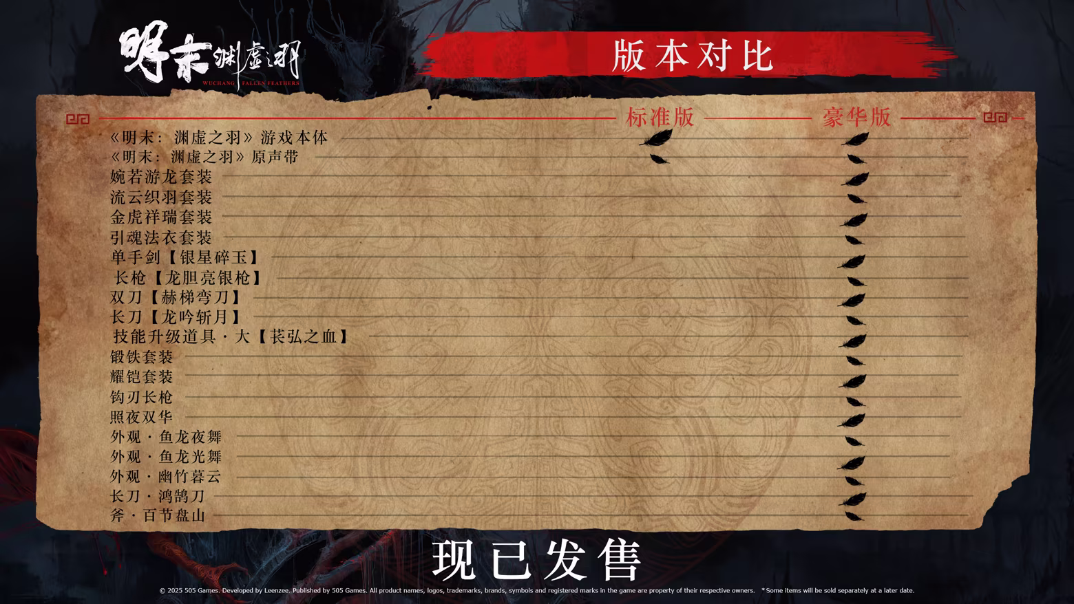 WUCHANG: Fallen Feathers includes blood, violence and killing through weapon-based combat. This includes depictions of violence of various weapons slashing, impaling or slicing enemies, visualized with blood.