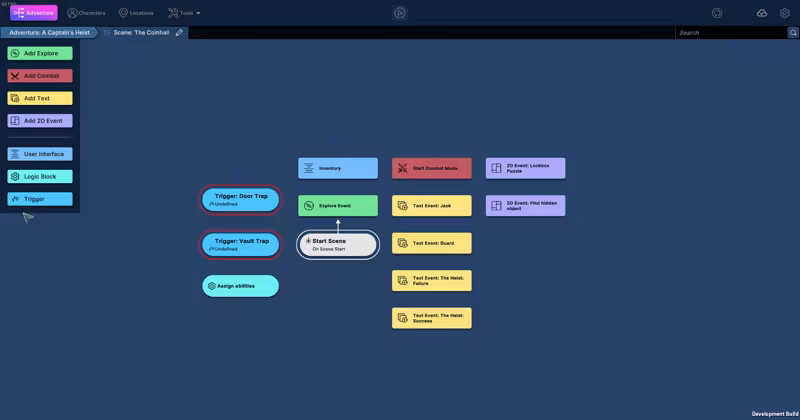 The core of Adventure Forge is the Adventure Flow which visually illustrates the flow of your game. Adventures are constructed from Scenes and within scenes are Events, this tiered system enables designers to layer different types of interactions such as having conversations appear over a visual novel or a lockpick mini-game over an isometric RPG. This nested approach allows every Scene and Event to contain its own logic thus avoiding the problem of a giant tangled web of branches and logic.