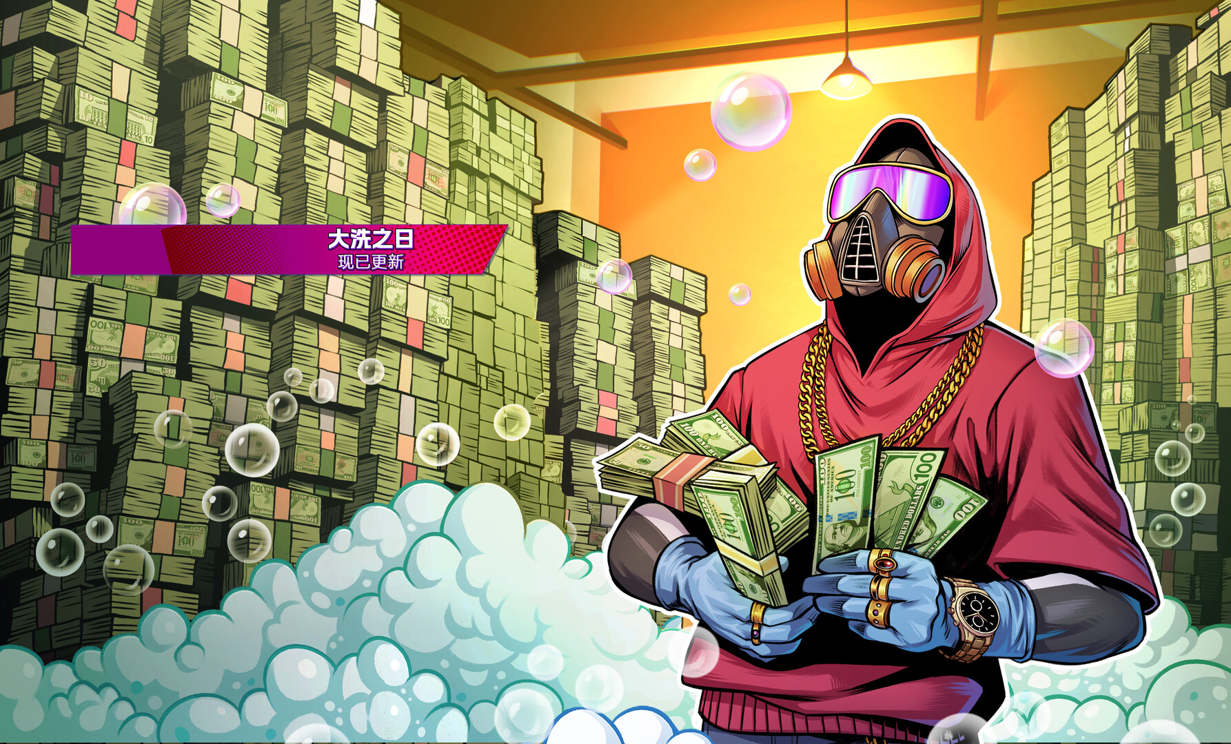 拥有大把钞票的满足感,却不用经历任何枪战!危险的事让别人去做吧;你来这里是为了放松身心,清洗脏钱,你才不在乎这些钱是怎么来的。有人把世界染成红色,而你要把它染成绿色!你懂的,就像那些干净崭新的钞票!