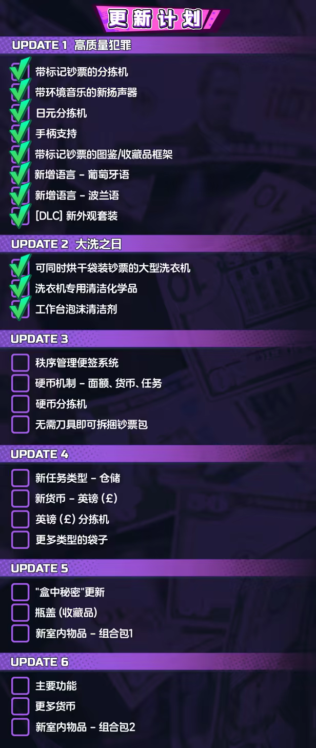 使用洗衣机、烘干机、点钞机和其他工具来清洗脏钱和区分假钞等工作。当然,看见沾上各种奇怪污垢或神秘“番茄酱”的钞子不要瞎猜,遵循祖训,老老实实干活赚钱就行了!同时,你也可以通过财富积累去置办新的设备,从而拓展业务规模,做大做强!