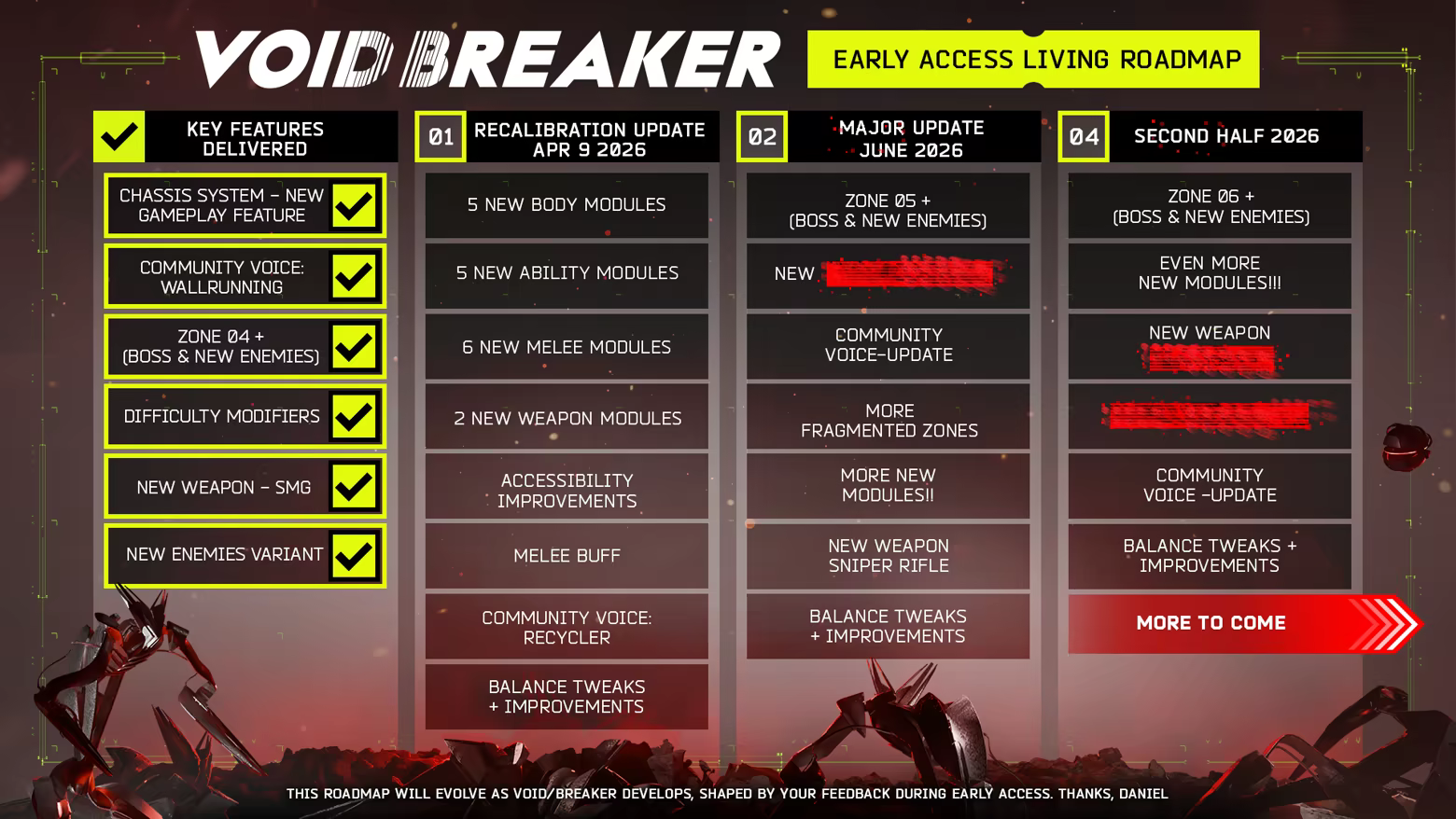 “I anticipate VOID/BREAKER being in Early Access for approximately 6–12 months. This timeline may evolve based on player feedback and ongoing development. As Early Access approaches, I'll share a detailed roadmap and keep you updated on our development plan.”