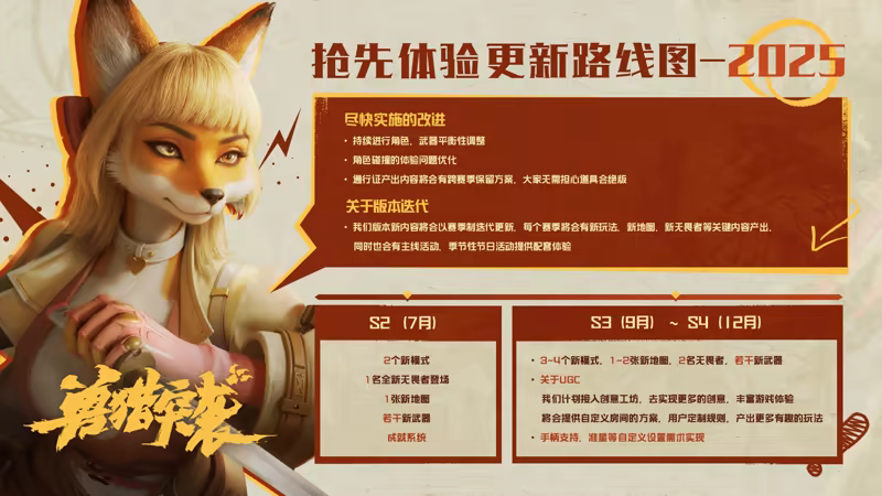 “《兽猎突袭》抢先体验版本共计开放了10名无畏者,30把武器,2个模式,3张地图,完整的新手教程、角色系统、枪匠系统、赛季系统,数十种个性化外观资源,并根据玩家的反馈针对游戏的性能、UI/UX、美术画面品质进行了全面提升,希望能带给玩家更好的游戏体验。”