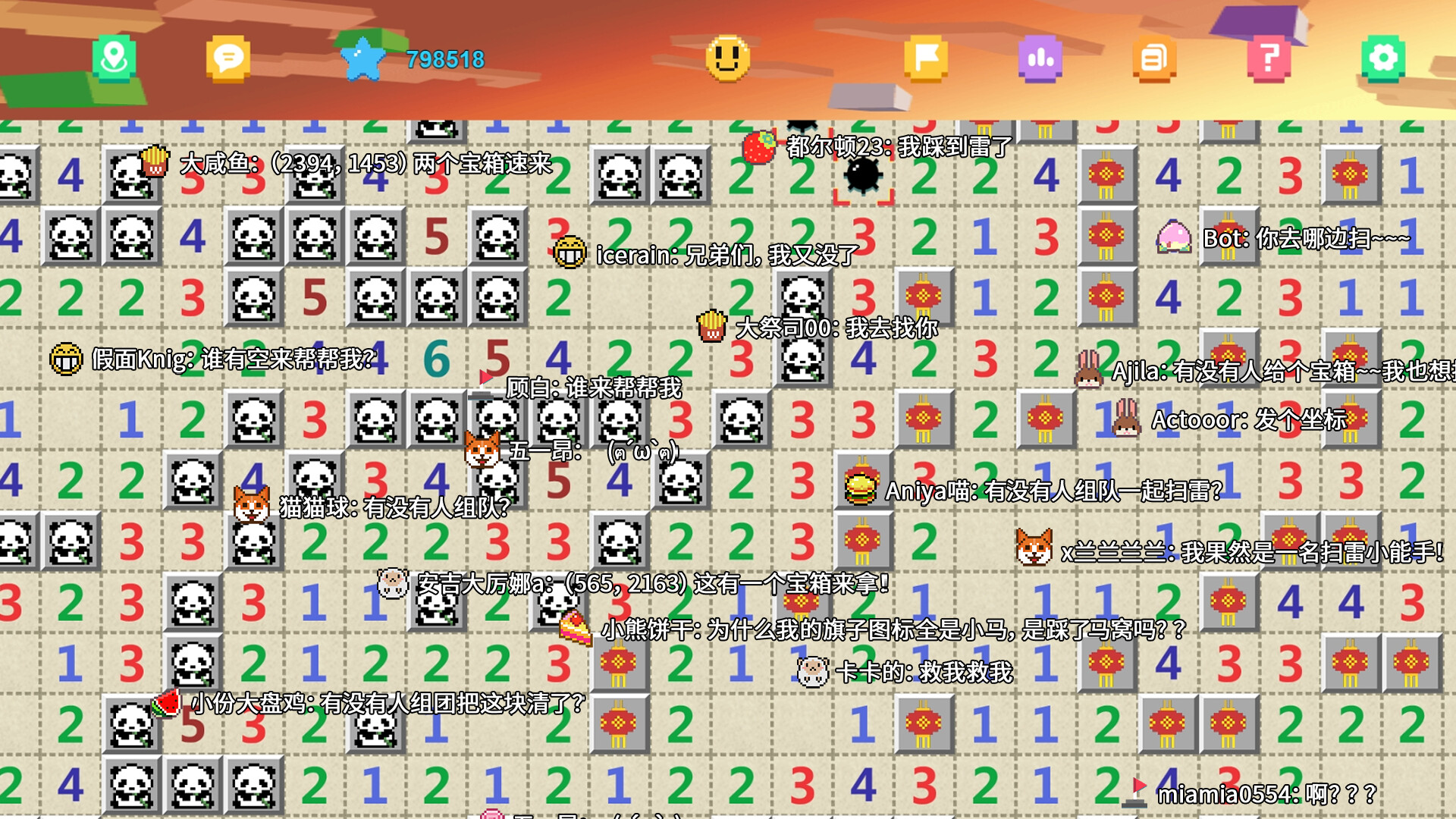 《一起来扫雷》是一款可以让全球玩家同时游玩的在线扫雷游戏,每局将在4800万格的雷区中设置超过1000万颗雷。玩家们可以进入任意一片雷区,开始“规划”自己的领土,净化这片雷区。你也可以装扮自己的界面,在地图上留下自己风骚的走位。随时上线随时扫,摸鱼休闲最佳之选!