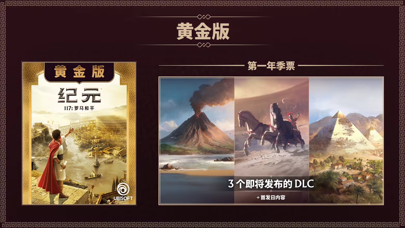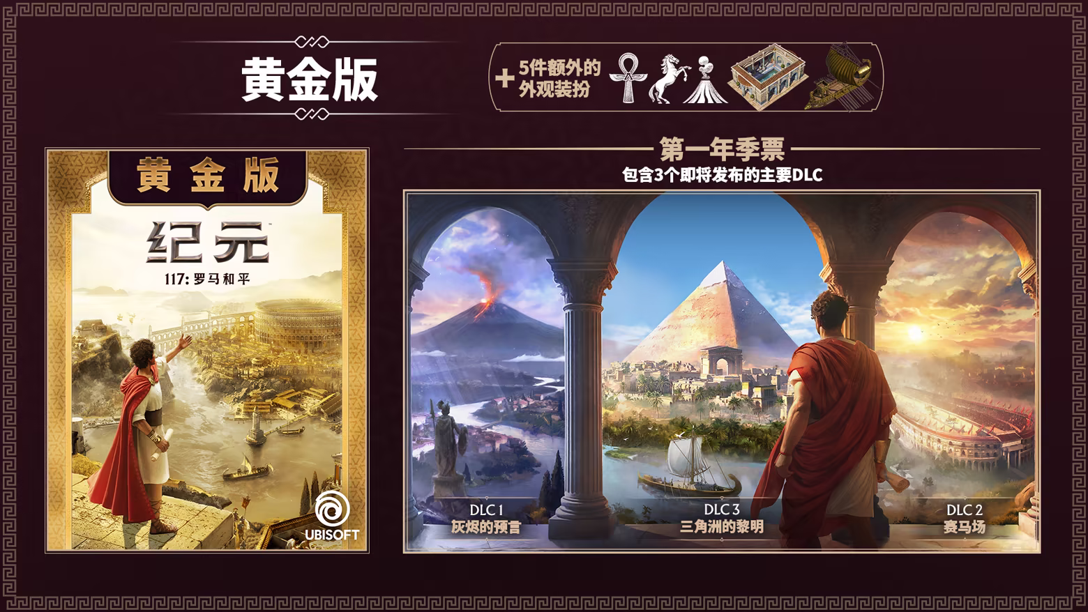 在黄金版中,你将体验到《纪元117:罗马和平》的主线冒险,并通过第 1 年季票将疆域拓展至新行省——内含 3 个 DLC 和 5 个装饰道具奖励!
