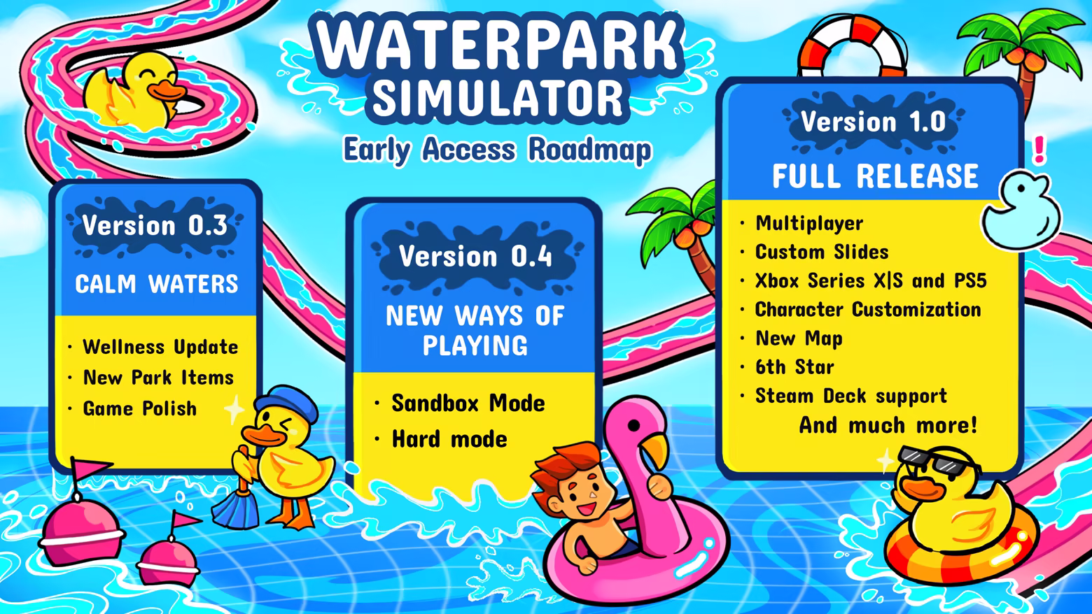 ““我们预计《水上乐园模拟器》(Waterpark Simulator) 的抢先体验阶段将会持续 9 至 12 个月,实际时间可能会依照开发进度与社区回馈而调整。在此期间,我们将专注于优化系统、增加新内容,并让整体游戏体验更加完善有趣。””