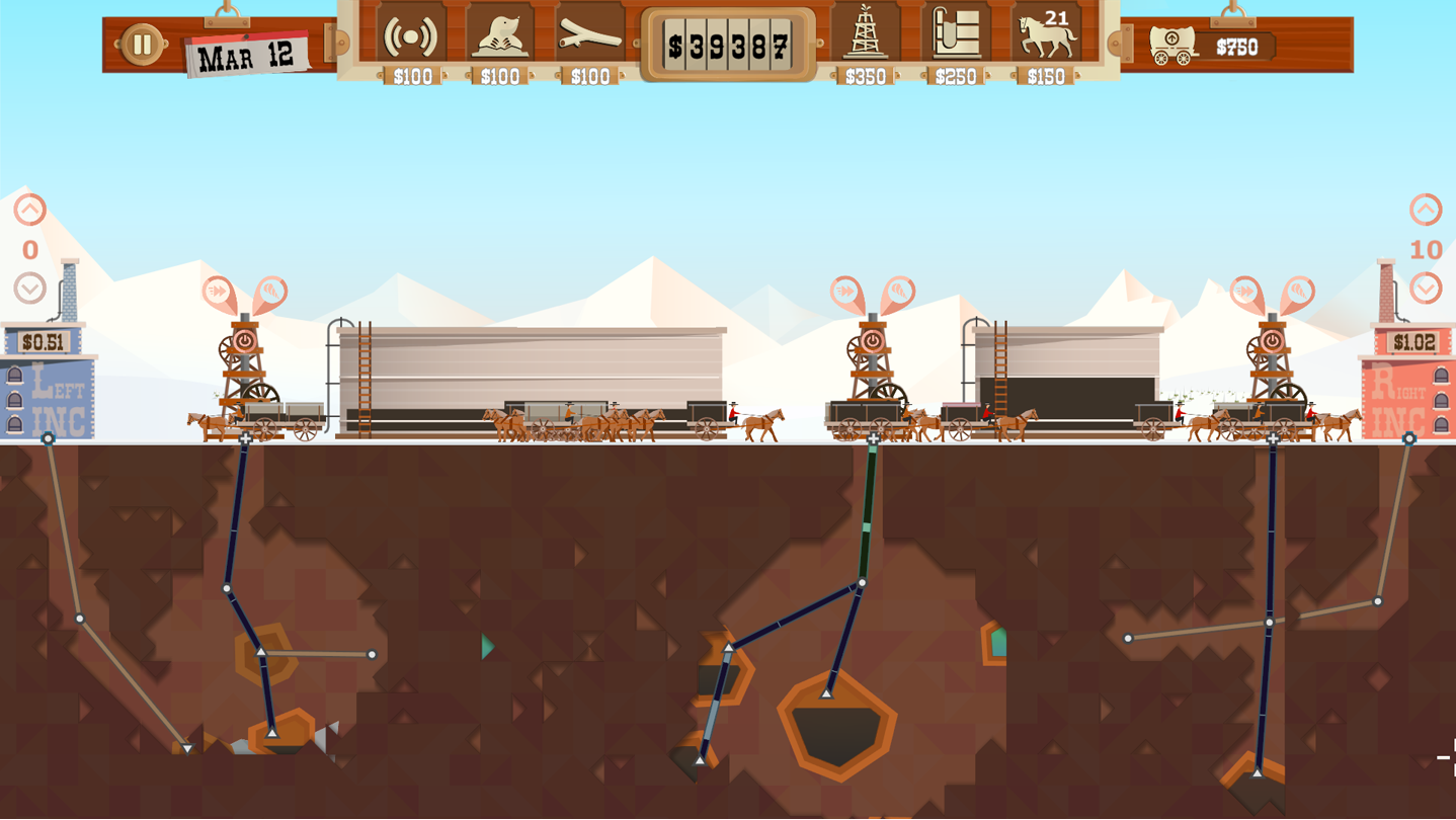 在小镇拍卖会上租土地,寻找石油。建造钻井设备,创建一个高效的管道网络,挖出石油并将它们存储在筒仓中。在最佳时间出售石油,使利润最大化。而后,购买镇上的基本升级以应付岩石、天然气和冰块。在竞标中获得比竞争对手更多的股份,成为新市长。